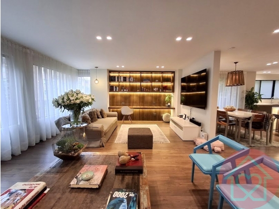 Lindísimo apartamento totalmente remodelado en Chicó. 156.11 m2. Piso 2. Cuenta con sala con amplios ventanales, diseño interior en madera, sistema de luces indirectas, pisos en madera, chimenea a gas, comedor independiente, cocina abierta amplia en L, patio de ropas, cuarto y baño de servicio, baño social. El área privada tiene hall de alcobas, 3 habitaciones, la principal con baño privado, vestier, 3 closets adicionales, tocador o mueble de estudio, las otras habitaciones comparten un baño. Tiene 2 parqueaderos independientes y un depósito. Portería con vigilancia 24 horas. Muy cerca del Parque Museo El Chicó y de la Embajada de Francia.
